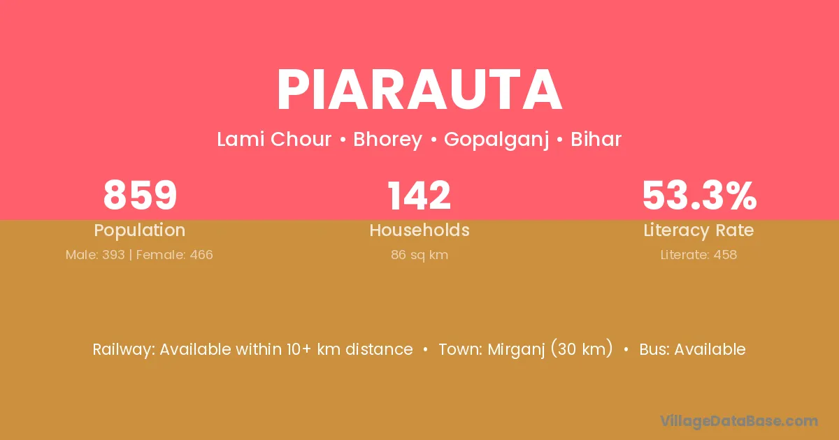 Mirganj (30 km) is the nearest town to Piarauta village for major economic activities and is located approximately 30 km away.