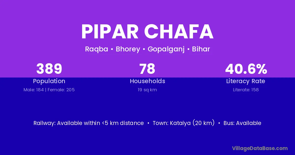 Kataiya (20 km) is the nearest town to Pipar Chafa village for major economic activities and is located approximately 20 km away.