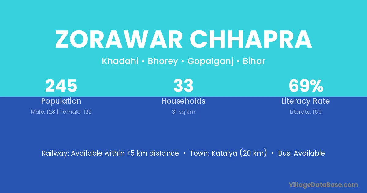 Kataiya (20 km) is the nearest town to Zorawar Chhapra village for major economic activities and is located approximately 20 km away.