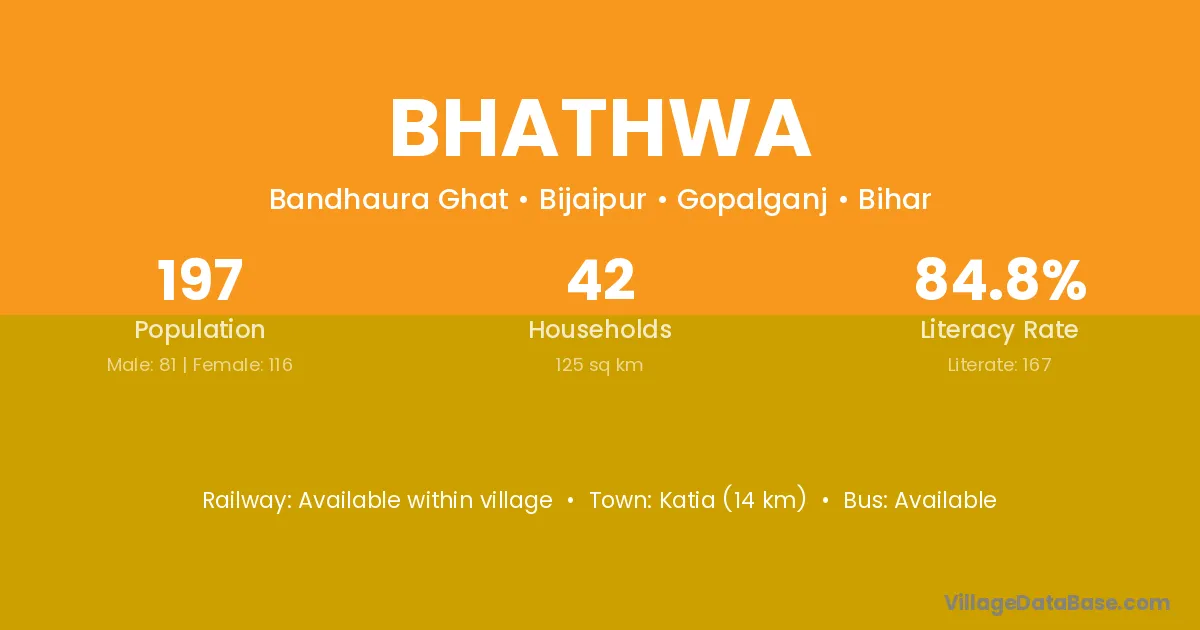 Bhathwa village has a total population of 197 people, of which 81 are males and 116 are females.