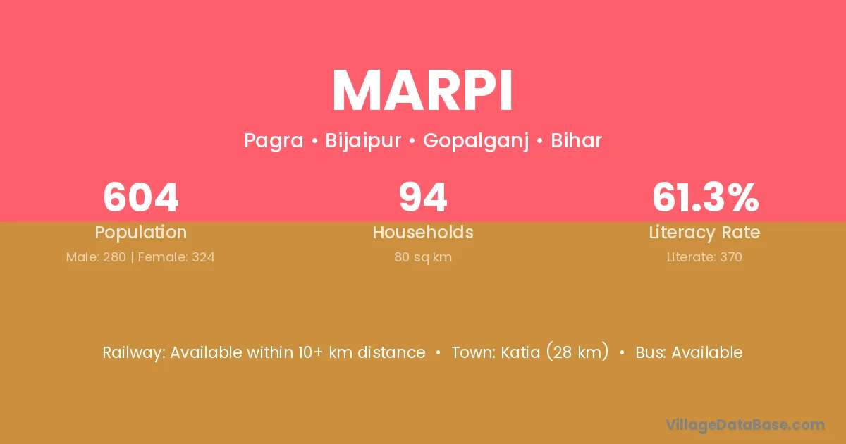 Marpi village has a total population of 604 people, of which 280 are males and 324 are females.