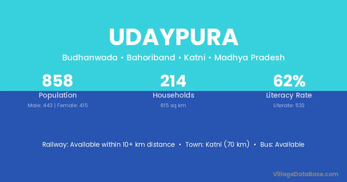 Katia (14 km) is the nearest town to Udaypura village for major economic activities and is located approximately 14 km away.