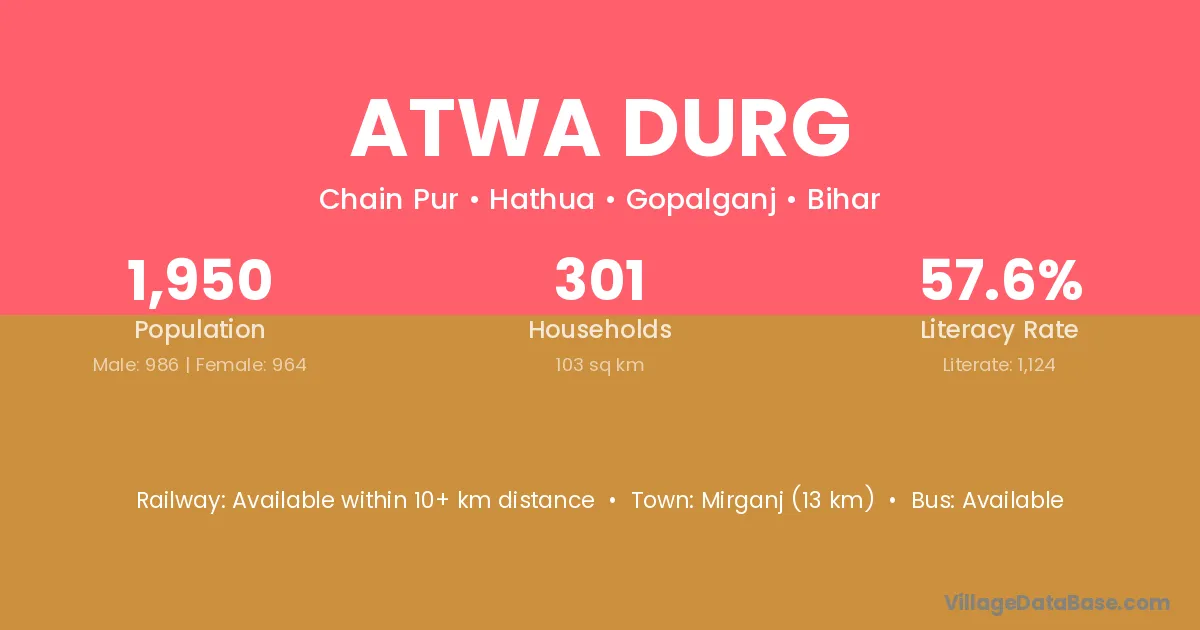 Mirganj (13 km) is the nearest town to Atwa Durg village for major economic activities and is located approximately 13 km away.