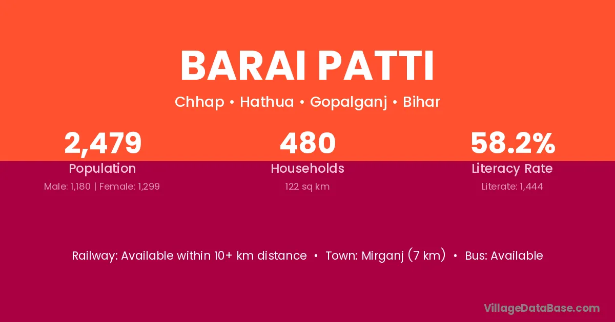 Mirganj (7 km) is the nearest town to Barai Patti village for major economic activities and is located approximately 7 km away.