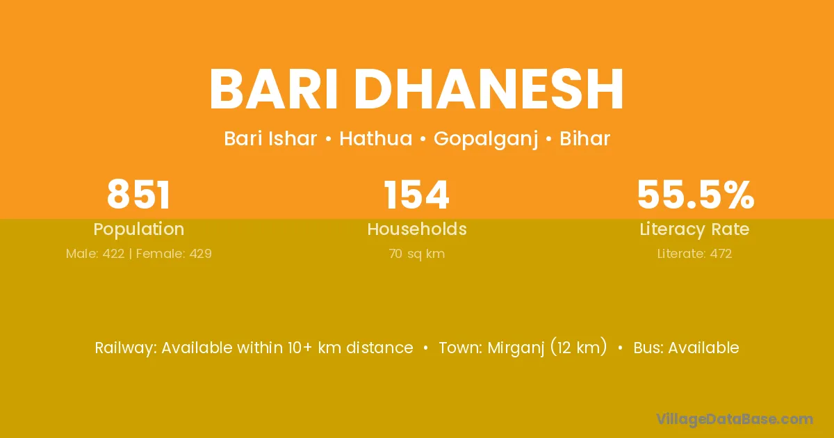 Mirganj (12 km) is the nearest town to Bari Dhanesh village for major economic activities and is located approximately 12 km away.