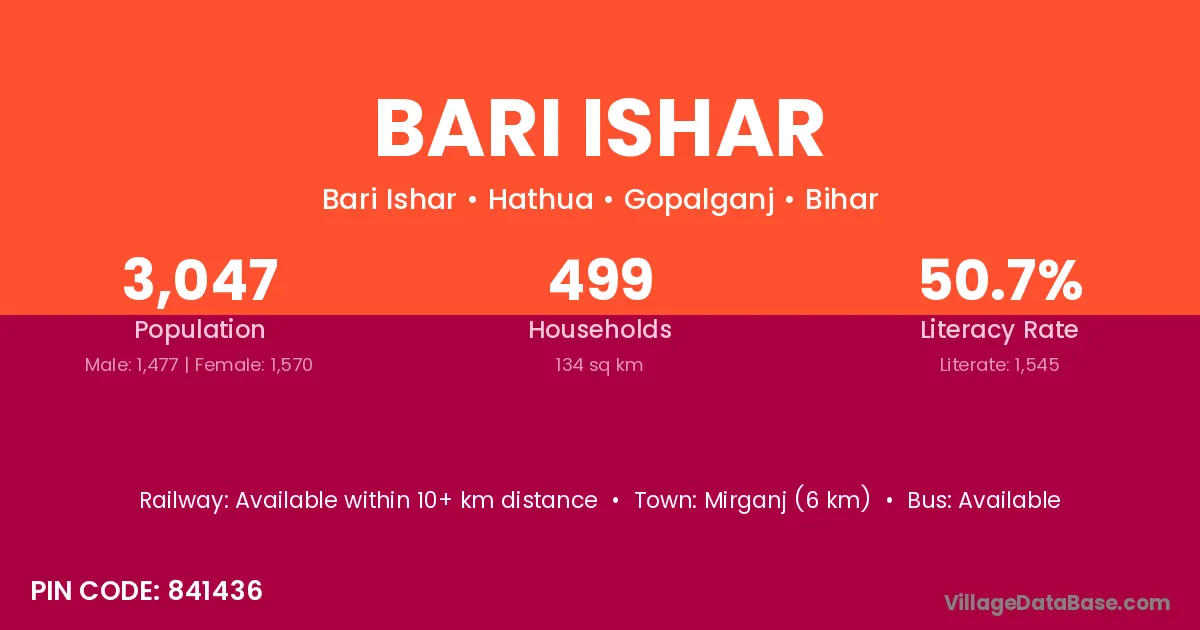 Mirganj (6 km) is the nearest town to Bari Ishar village for major economic activities and is located approximately 6 km away.