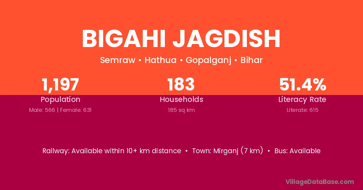 Bigahi Jagdish village has a total population of 1,197 people, of which 566 are males and 631 are females.