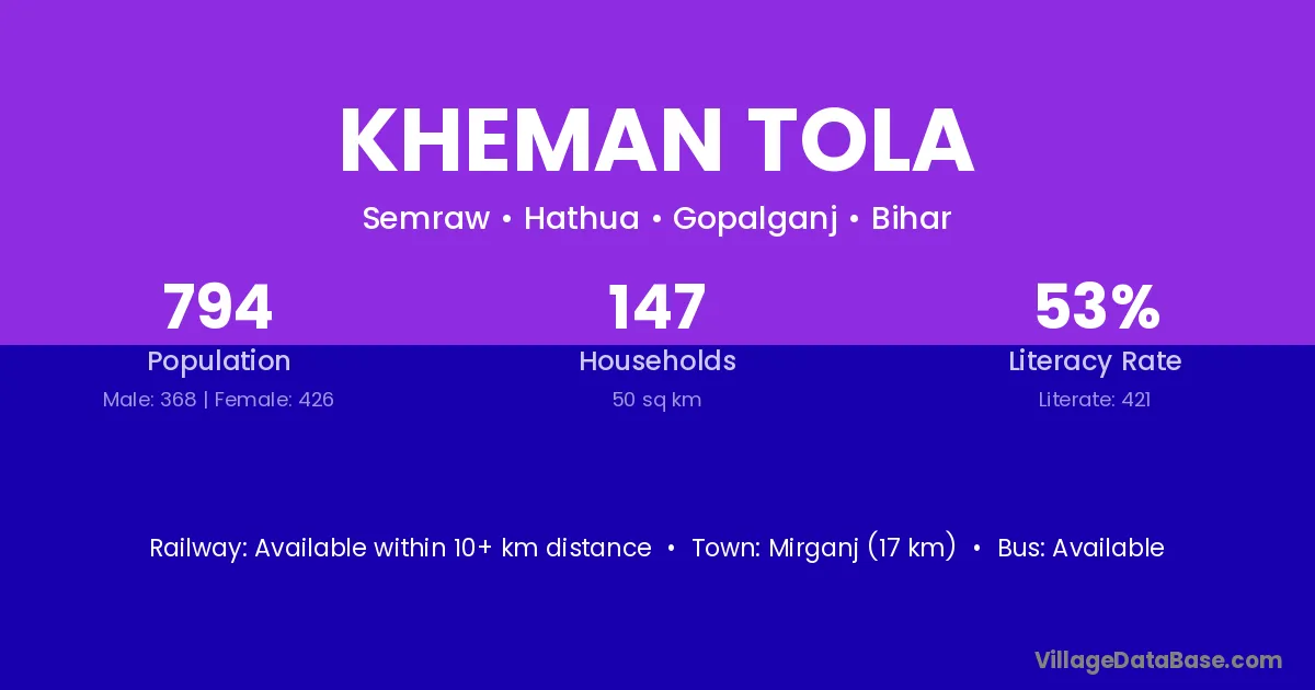Mirganj (17 km) is the nearest town to Kheman Tola village for major economic activities and is located approximately 17 km away.