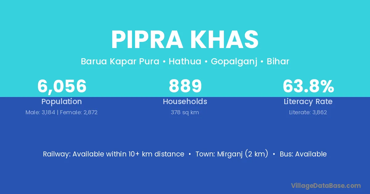 Mirganj (2 km) is the nearest town to Pipra Khas village for major economic activities and is located approximately 2 km away.