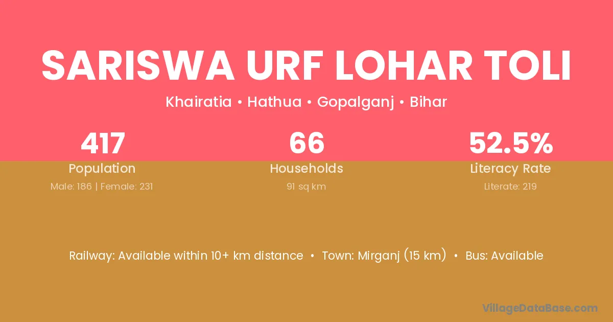 Sariswa Urf Lohar Toli village has a total population of 417 people, of which 186 are males and 231 are females.