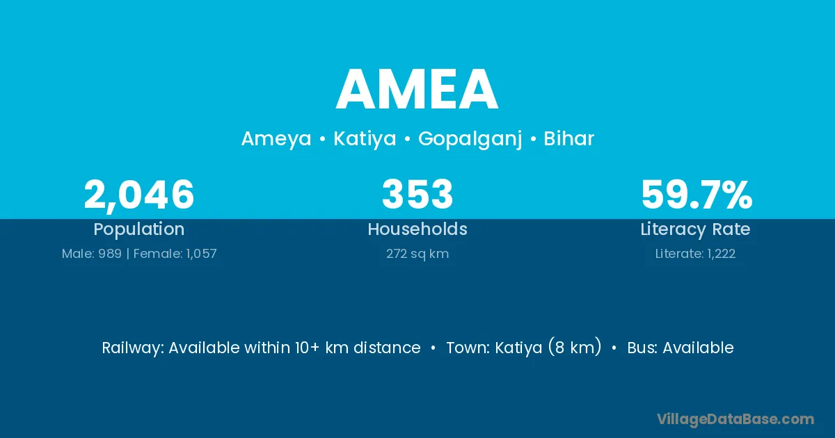 Katiya (8 km) is the nearest town to Amea village for major economic activities and is located approximately 8 km away.