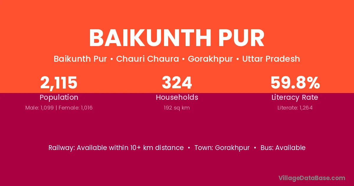 The literacy rate of Baikunth Pur village is 64.82%. Male literacy stands at 73.51% and female literacy at 57.03%.