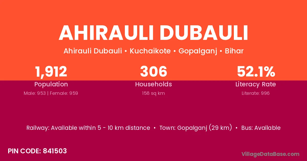 Ahirauli Dubauli village has a total population of 1,912 people, of which 953 are males and 959 are females.