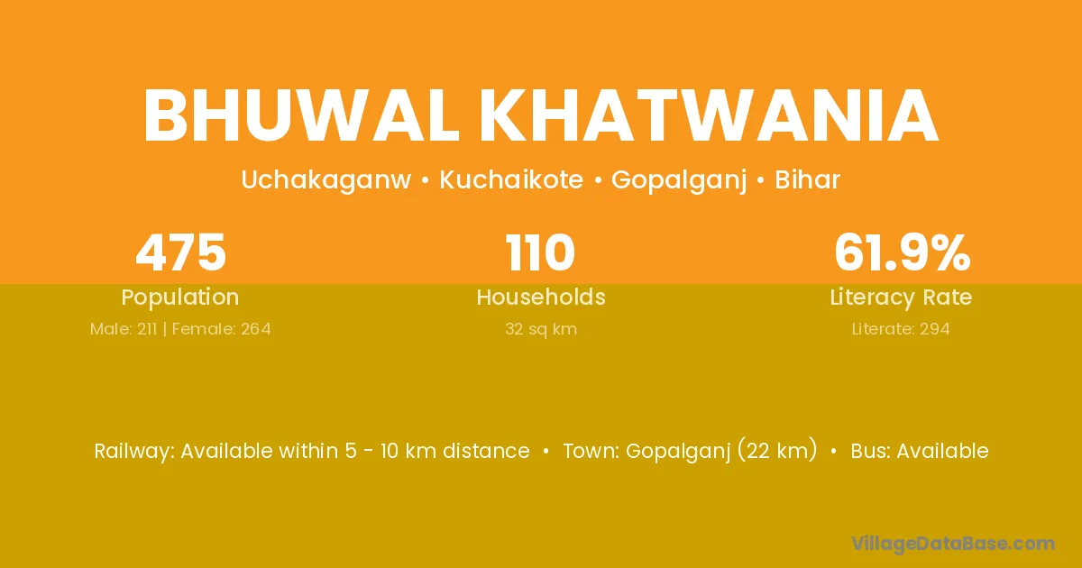 Bhuwal Khatwania village has a total population of 475 people, of which 211 are males and 264 are females.
