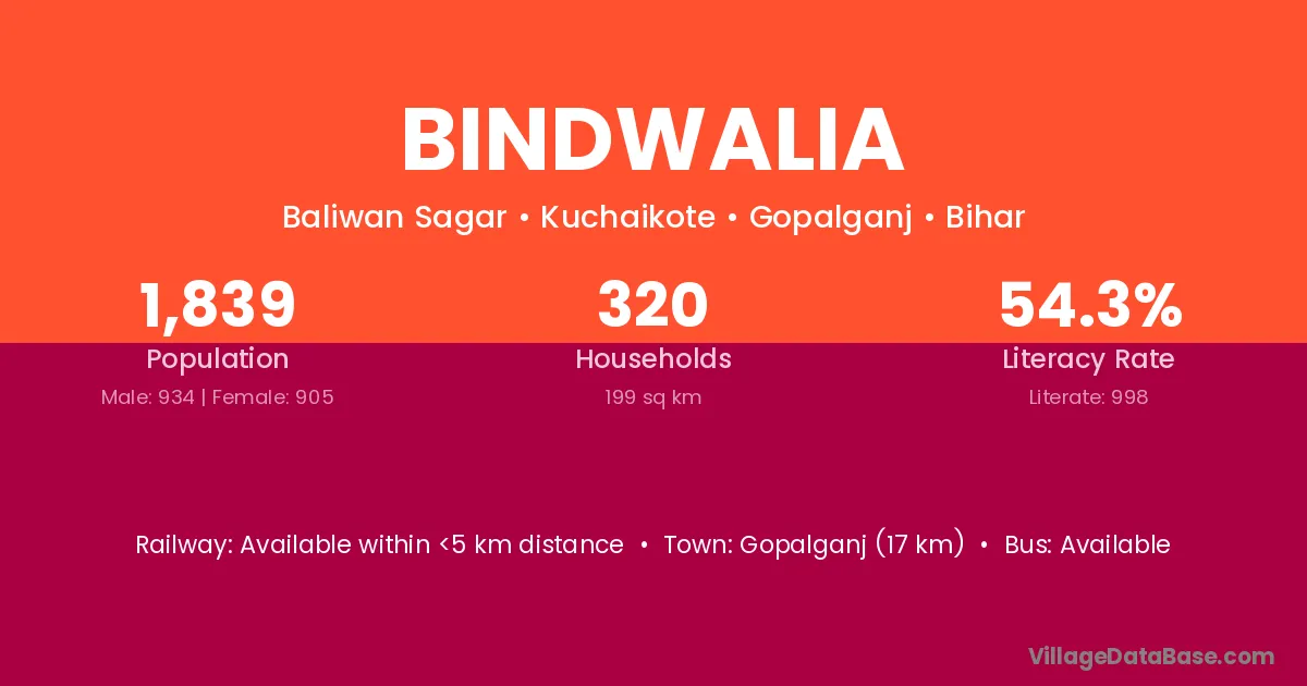 Gopalganj (17 km) is the nearest town to Bindwalia village for major economic activities and is located approximately 17 km away.