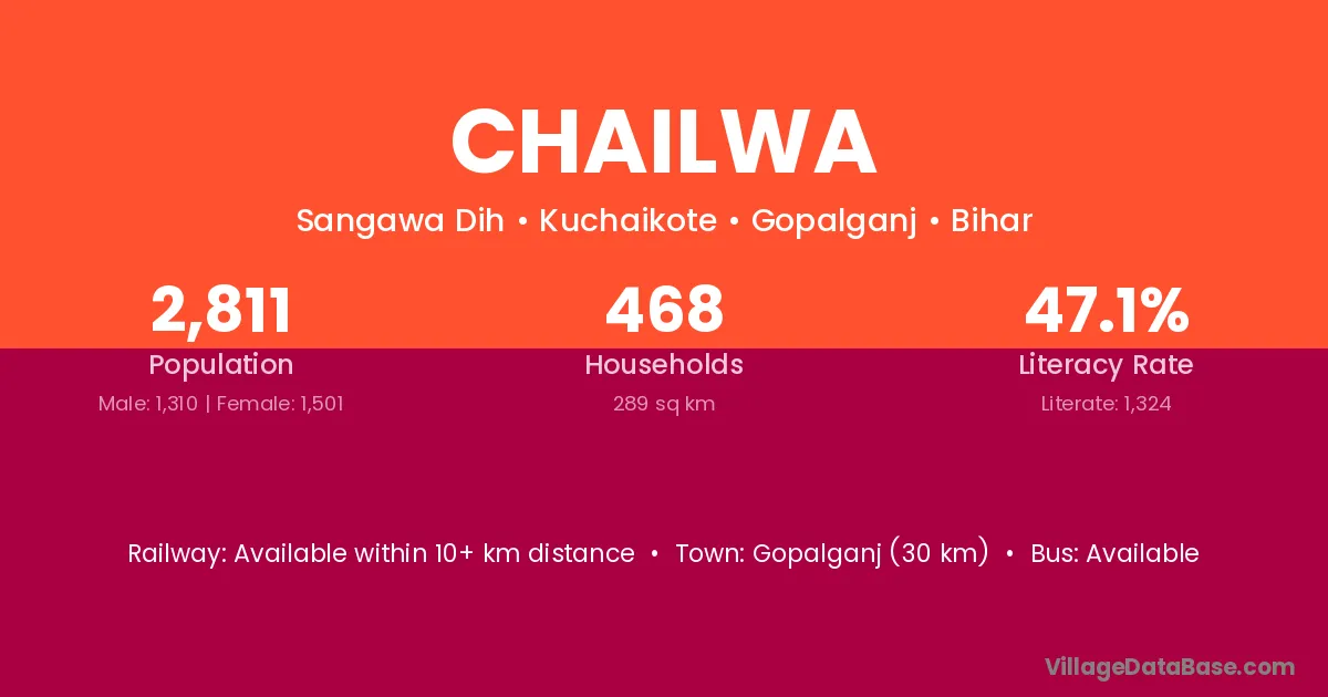 Gopalganj (30 km) is the nearest town to Chailwa village for major economic activities and is located approximately 30 km away.