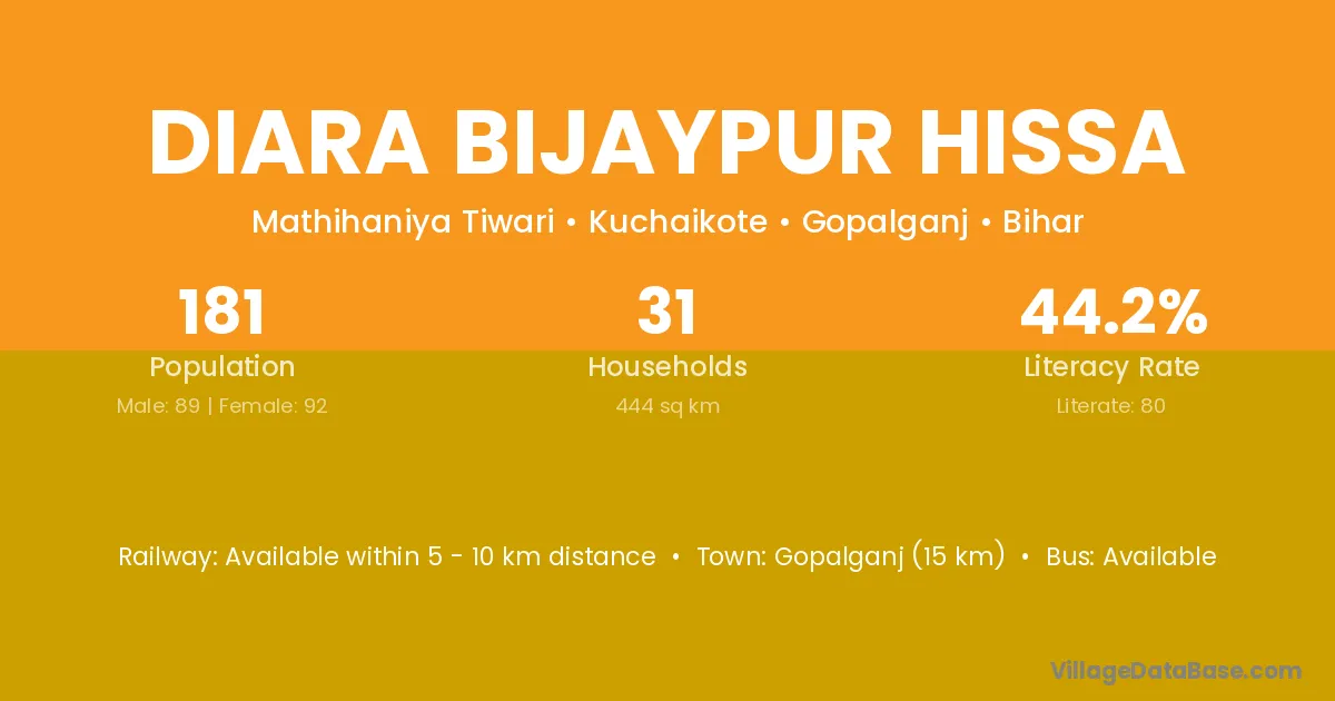 Diara Bijaypur Hissa village has a total population of 181 people, of which 89 are males and 92 are females.