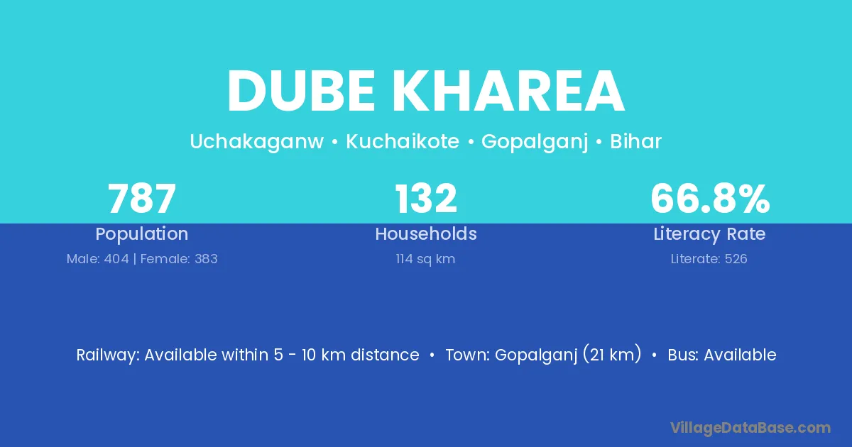 Gopalganj (21 km) is the nearest town to Dube Kharea village for major economic activities and is located approximately 21 km away.