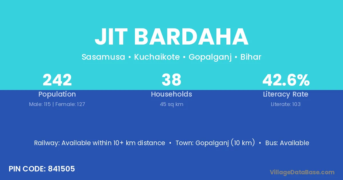 Jit Bardaha village has a total population of 242 people, of which 115 are males and 127 are females.