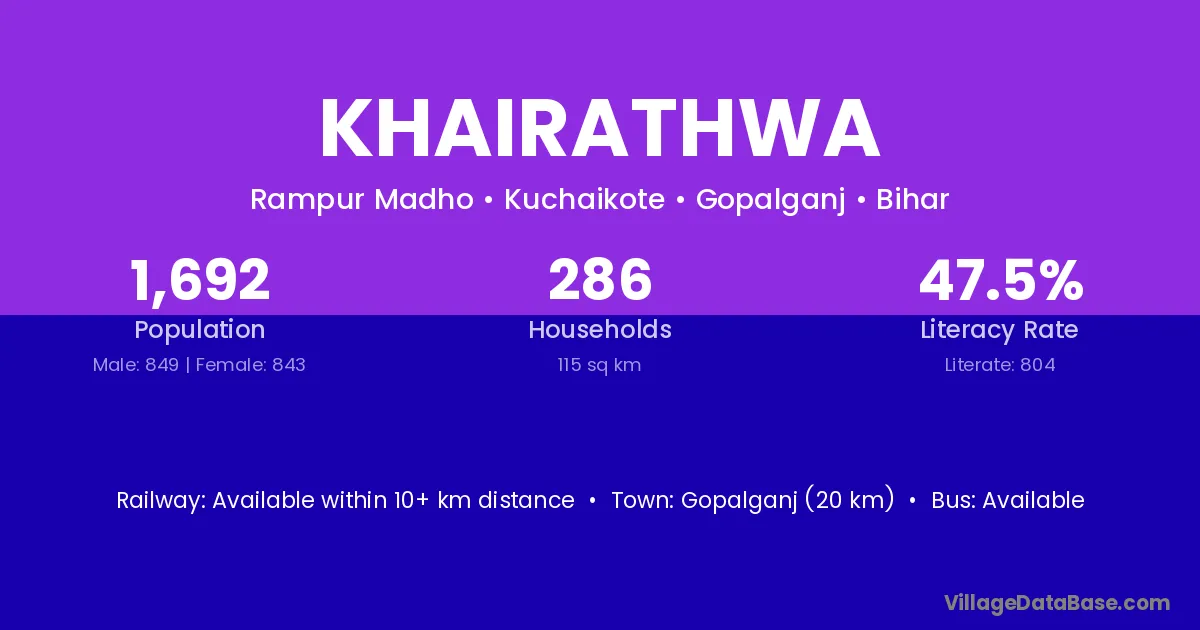 Gopalganj (20 km) is the nearest town to Khairathwa village for major economic activities and is located approximately 20 km away.