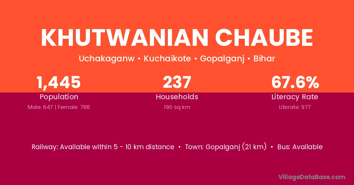 Gopalganj (21 km) is the nearest town to Khutwanian Chaube village for major economic activities and is located approximately 21 km away.