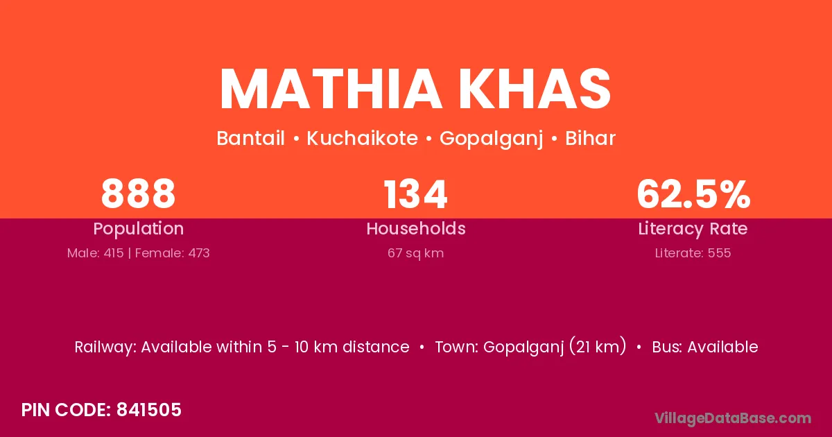 Gopalganj (21 km) is the nearest town to Mathia Khas village for major economic activities and is located approximately 21 km away.