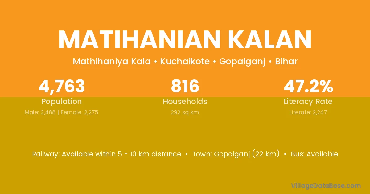 Gopalganj (22 km) is the nearest town to Matihanian Kalan village for major economic activities and is located approximately 22 km away.