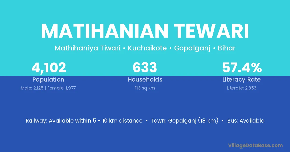 Gopalganj (18 km) is the nearest town to Matihanian Tewari village for major economic activities and is located approximately 18 km away.
