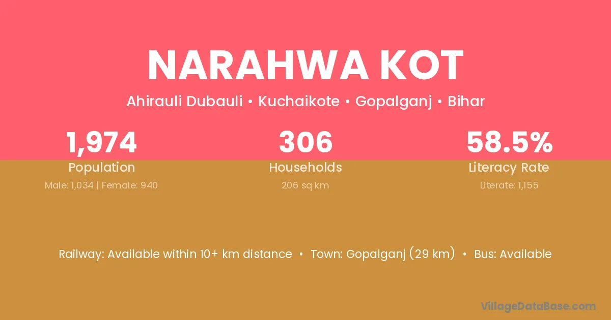 Narahwa Kot village has a total population of 1,974 people, of which 1,034 are males and 940 are females.