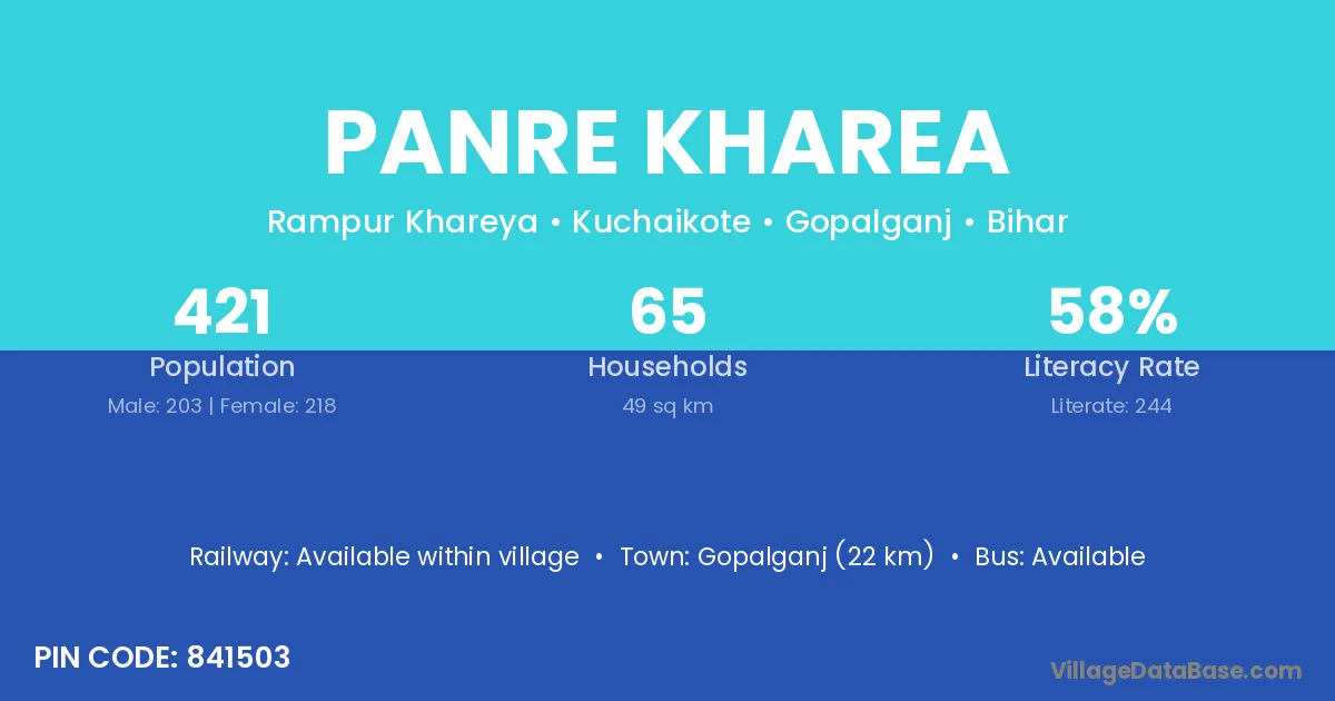 Gopalganj (22 km) is the nearest town to Panre Kharea village for major economic activities and is located approximately 22 km away.
