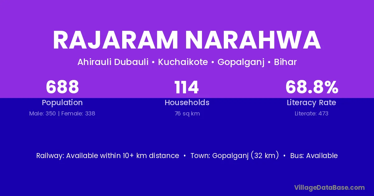 Rajaram Narahwa village has a total population of 688 people, of which 350 are males and 338 are females.