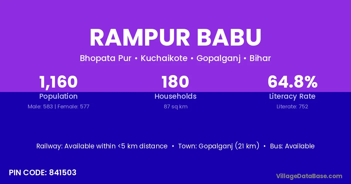 Gopalganj (21 km) is the nearest town to Rampur Babu village for major economic activities and is located approximately 21 km away.