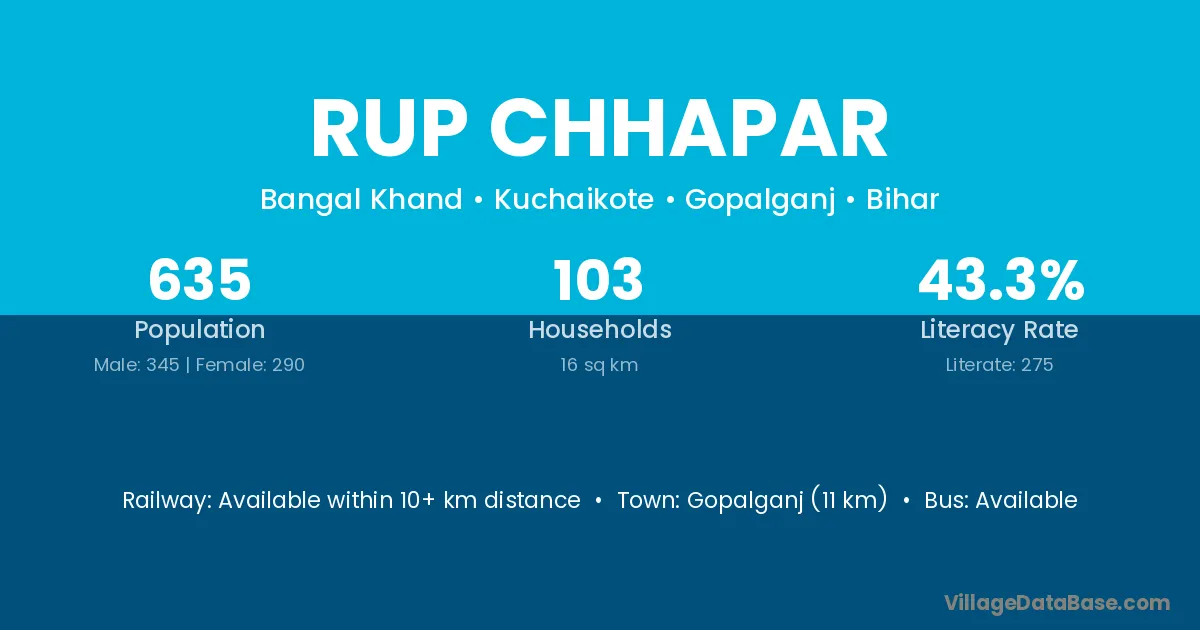 Gopalganj (11 km) is the nearest town to Rup Chhapar village for major economic activities and is located approximately 11 km away.