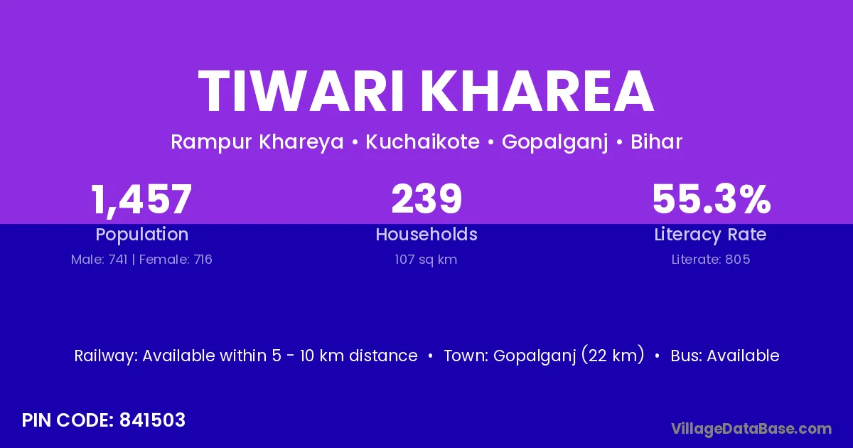 Tiwari Kharea village has a total population of 1,457 people, of which 741 are males and 716 are females.