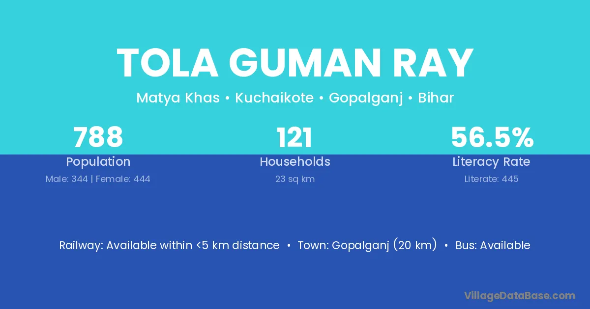 Gopalganj (20 km) is the nearest town to Tola Guman Ray village for major economic activities and is located approximately 20 km away.