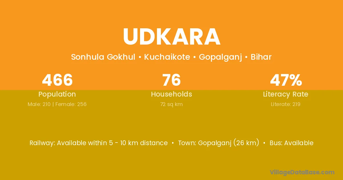 Gopalganj (26 km) is the nearest town to Udkara village for major economic activities and is located approximately 26 km away.