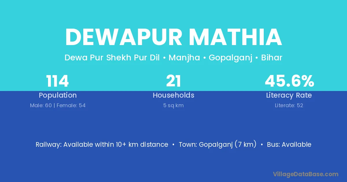 Gopalganj (7 km) is the nearest town to Dewapur Mathia village for major economic activities and is located approximately 7 km away.
