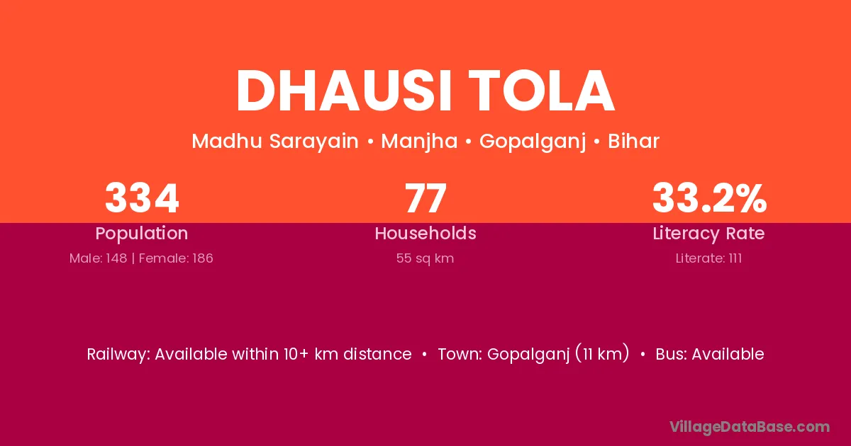 Dhausi Tola village has a total population of 334 people, of which 148 are males and 186 are females.