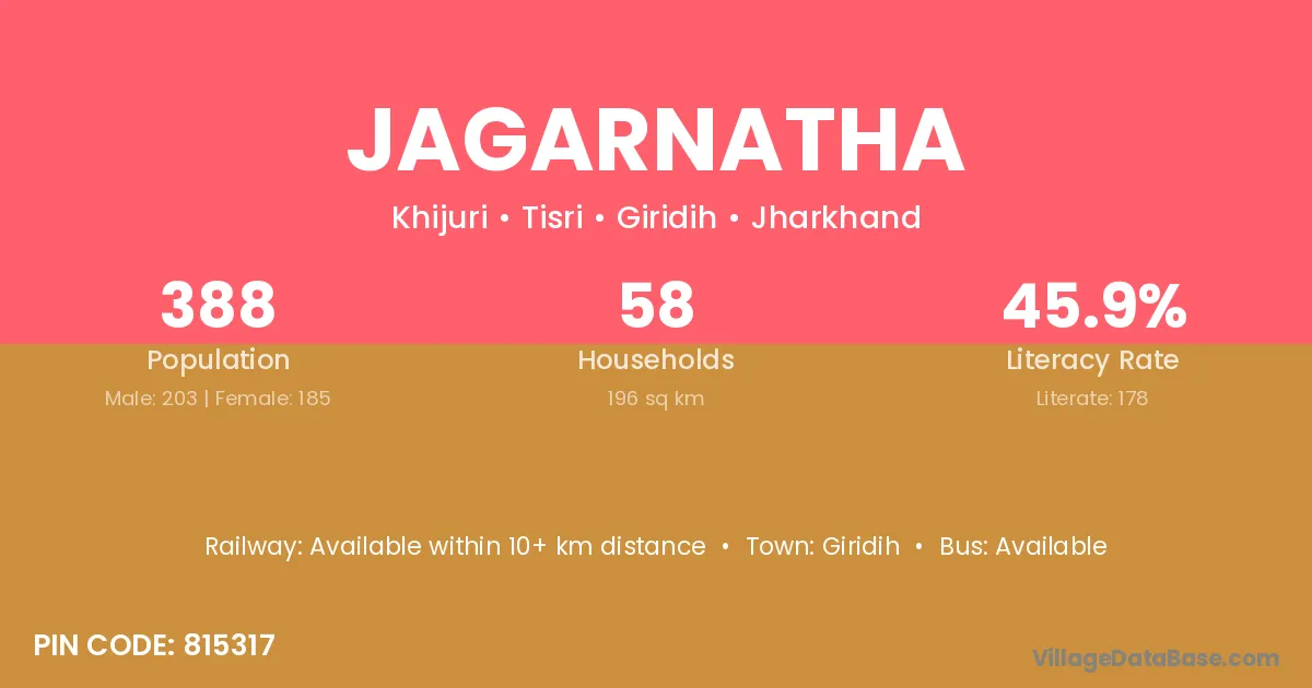 The literacy rate of Jagarnatha village is 52.49%. Male literacy stands at 61.93% and female literacy at 44.06%.