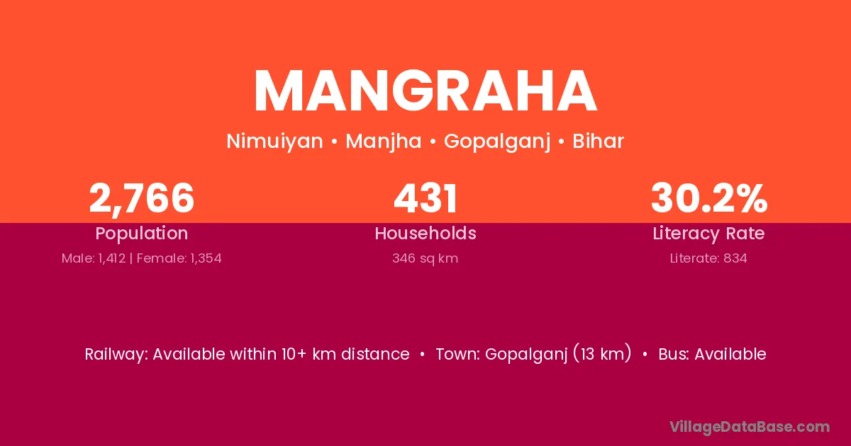Gopalganj (13 km) is the nearest town to Mangraha village for major economic activities and is located approximately 13 km away.