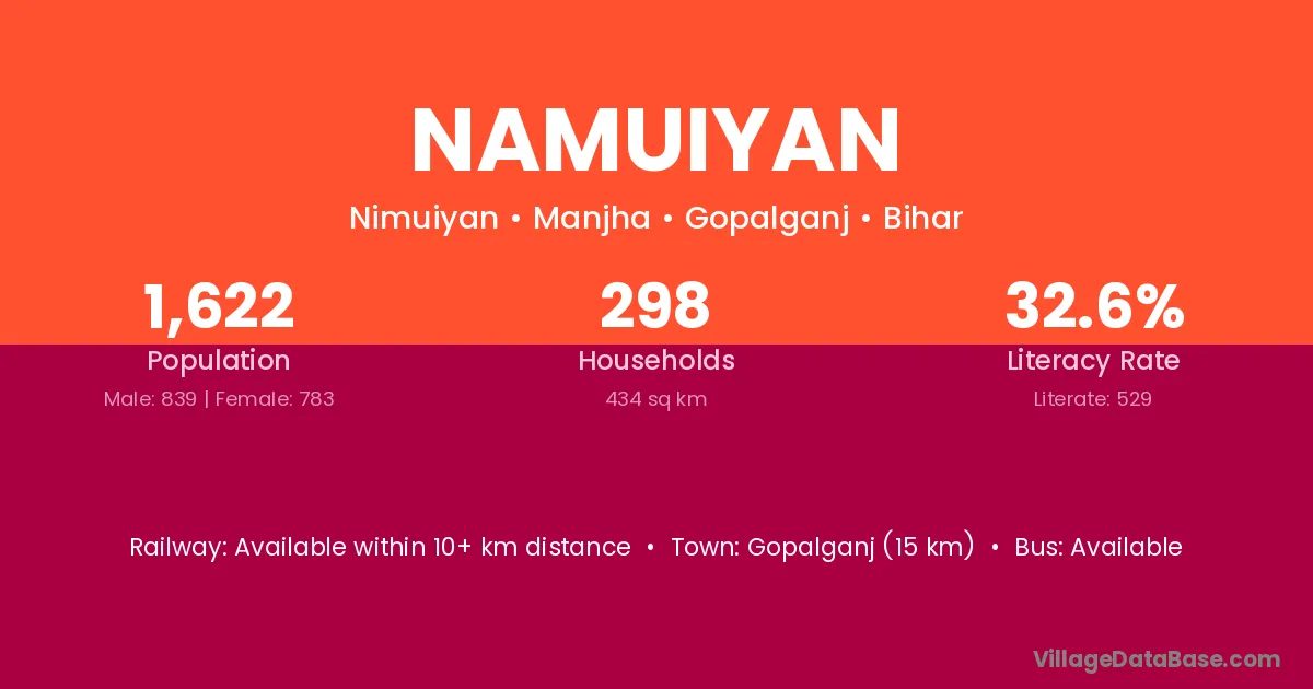 Gopalganj (15 km) is the nearest town to Namuiyan village for major economic activities and is located approximately 15 km away.