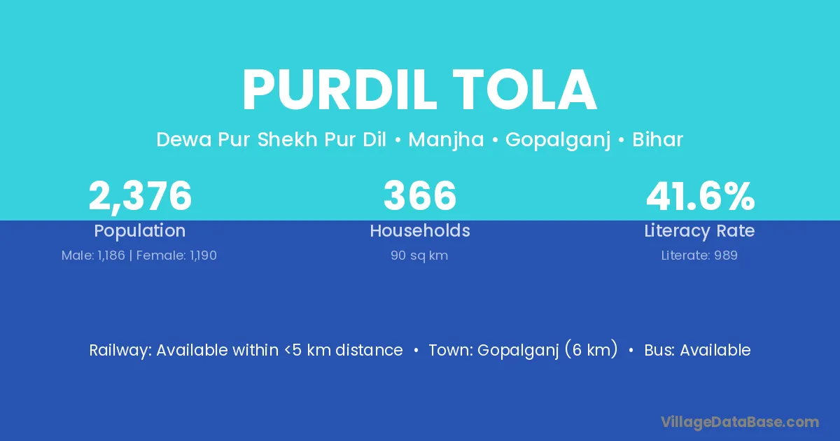 Gopalganj (6 km) is the nearest town to Purdil Tola village for major economic activities and is located approximately 6 km away.