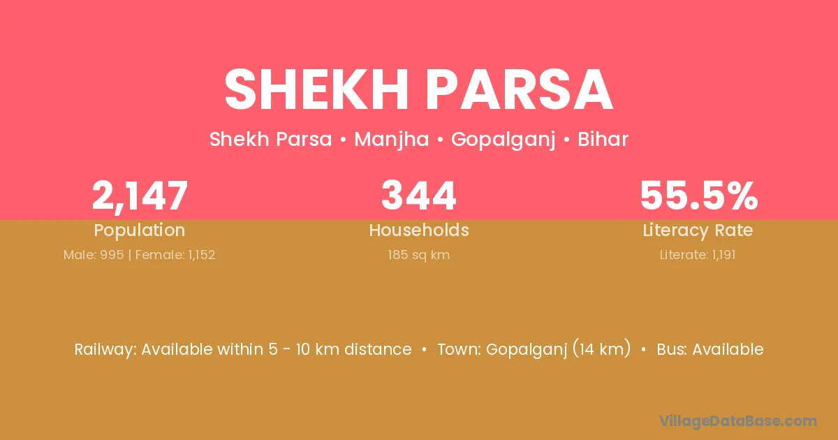 Gopalganj (14 km) is the nearest town to Shekh Parsa village for major economic activities and is located approximately 14 km away.