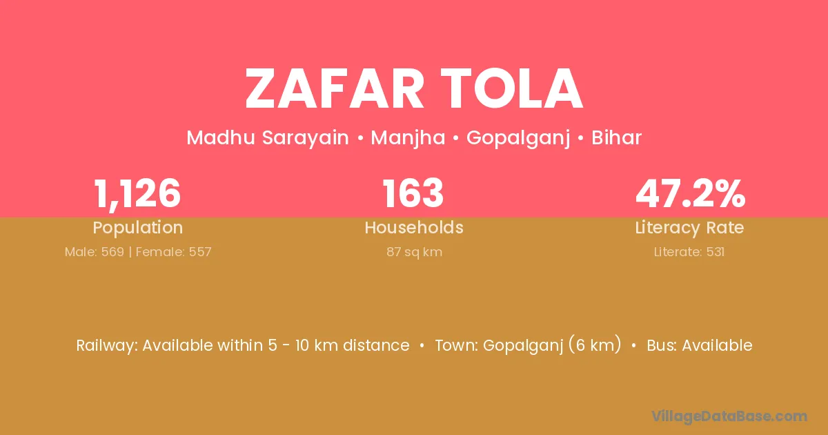 Gopalganj (6 km) is the nearest town to Zafar Tola village for major economic activities and is located approximately 6 km away.