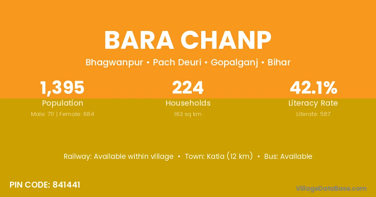 Bara Chanp village has a total population of 1,395 people, of which 711 are males and 684 are females.