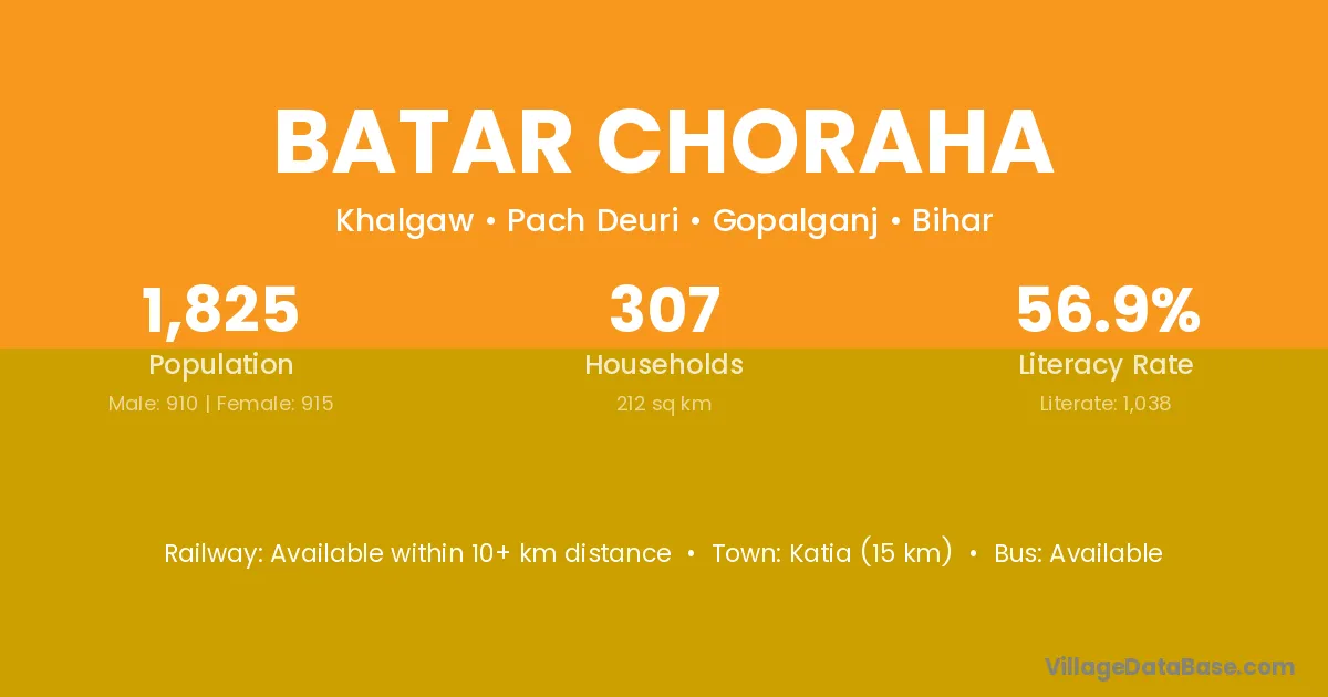 Katia (15 km) is the nearest town to Batar Choraha village for major economic activities and is located approximately 15 km away.
