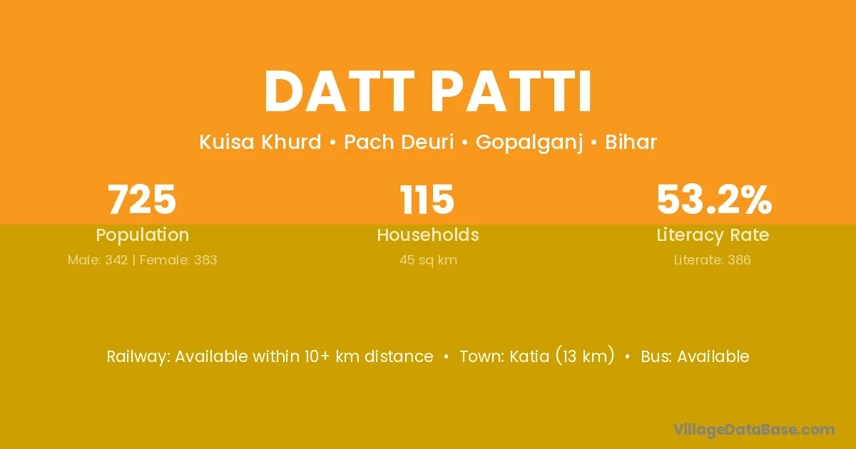 Katia (13 km) is the nearest town to Datt Patti village for major economic activities and is located approximately 13 km away.