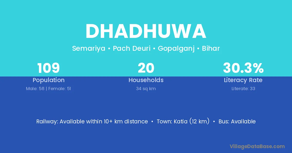 Dhadhuwa village has a total population of 109 people, of which 58 are males and 51 are females.