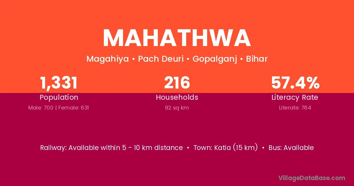 Mahathwa village has a total population of 1,331 people, of which 700 are males and 631 are females.