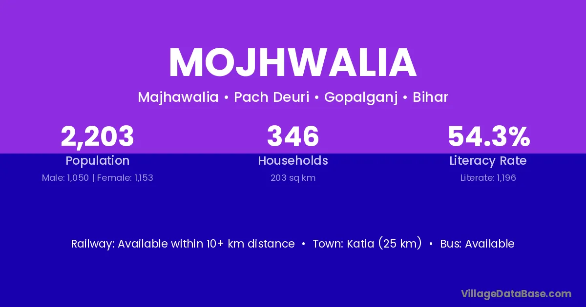 Mojhwalia village has a total population of 2,203 people, of which 1,050 are males and 1,153 are females.